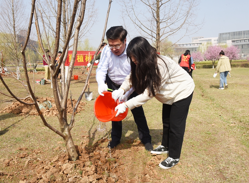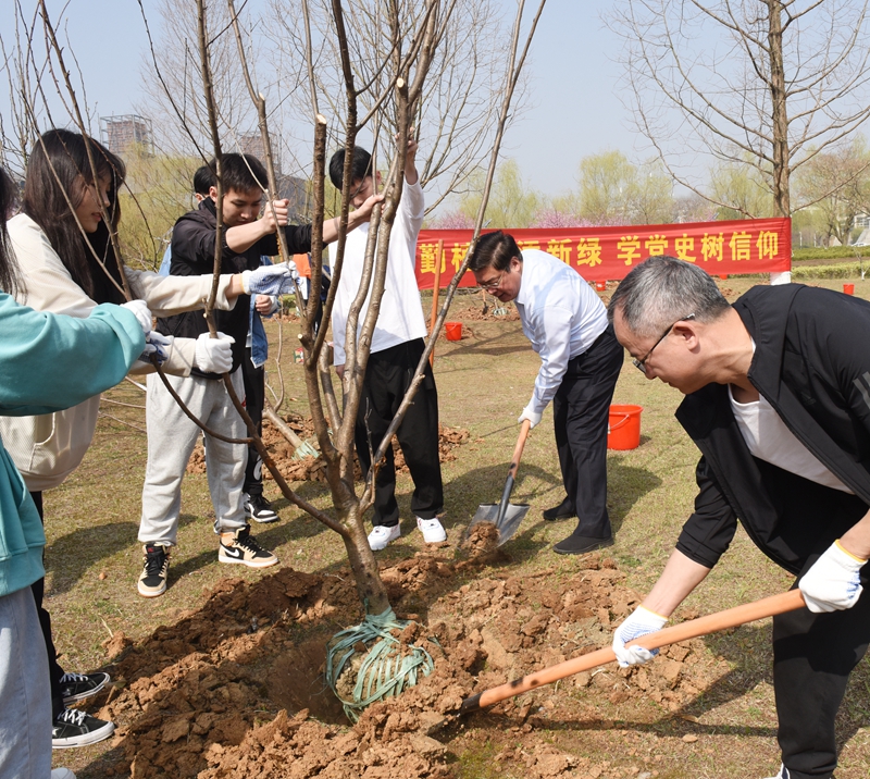 党课结束后,全体与会师生前往桃李园植树。党委常委、副院长郑锋带领后勤保障处相关负责人一起加入了植树活动。“小伙子,把树苗扶正,边填土边踩实,最后还要打一个土围!”“你们要像栽下的树苗一样耐住寂寞、潜心生长!”植树现场,场面火热。史书记手把手教植树小技巧,同学们分工明确,配合默契,有的挥锹挖坑,有的栽树培土,有的提水浇灌……道道工序细致认真、有条不紊。经过半个多小时的劳作,所有的树苗终于“安家落户”,16株新栽的桃树迎风挺立,成为校园一道亮丽的风景线。活动最后,师生踊跃在横幅上签下姓名,发起“勤植树添新绿 学党史树信仰”的倡议。