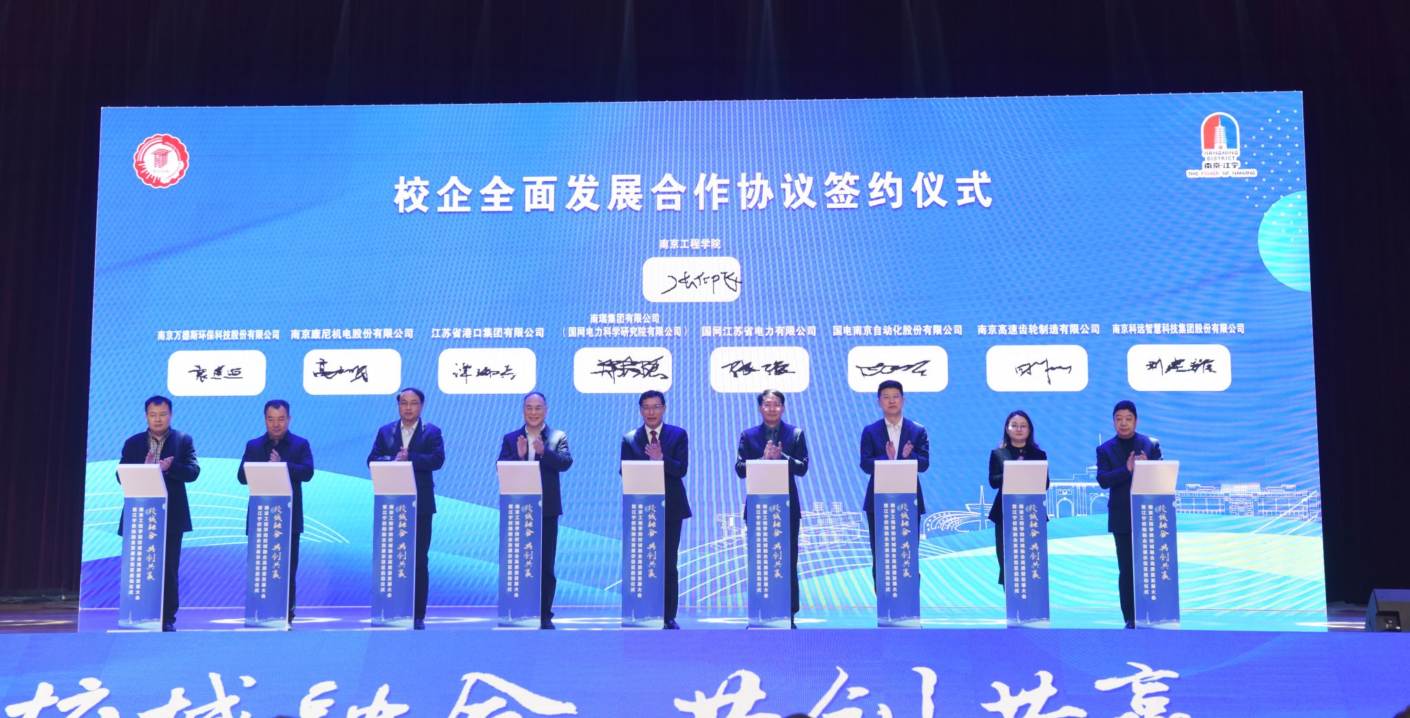 在与会人员的共同见证下,张仰飞与黄成文分别代表校地签订全面深化战略合作协议。江宁校地融合发展示范区同时正式启动,双方将整合南工程应用型高校的科教资源优势和江宁区的产业优势,以现有的新型研发机构、高等级平台、科技创业企业、大学科技园、技术转移中心、知识产权运营中心、产业学院和地方产业急需高水平应用型人才培养为基础,建成立足江宁、南京,辐射江苏的政产学研用为一体的校地融合发展示范区,打造全省领先、全国知名的校地融合发展典范区,共建“世界电谷”。