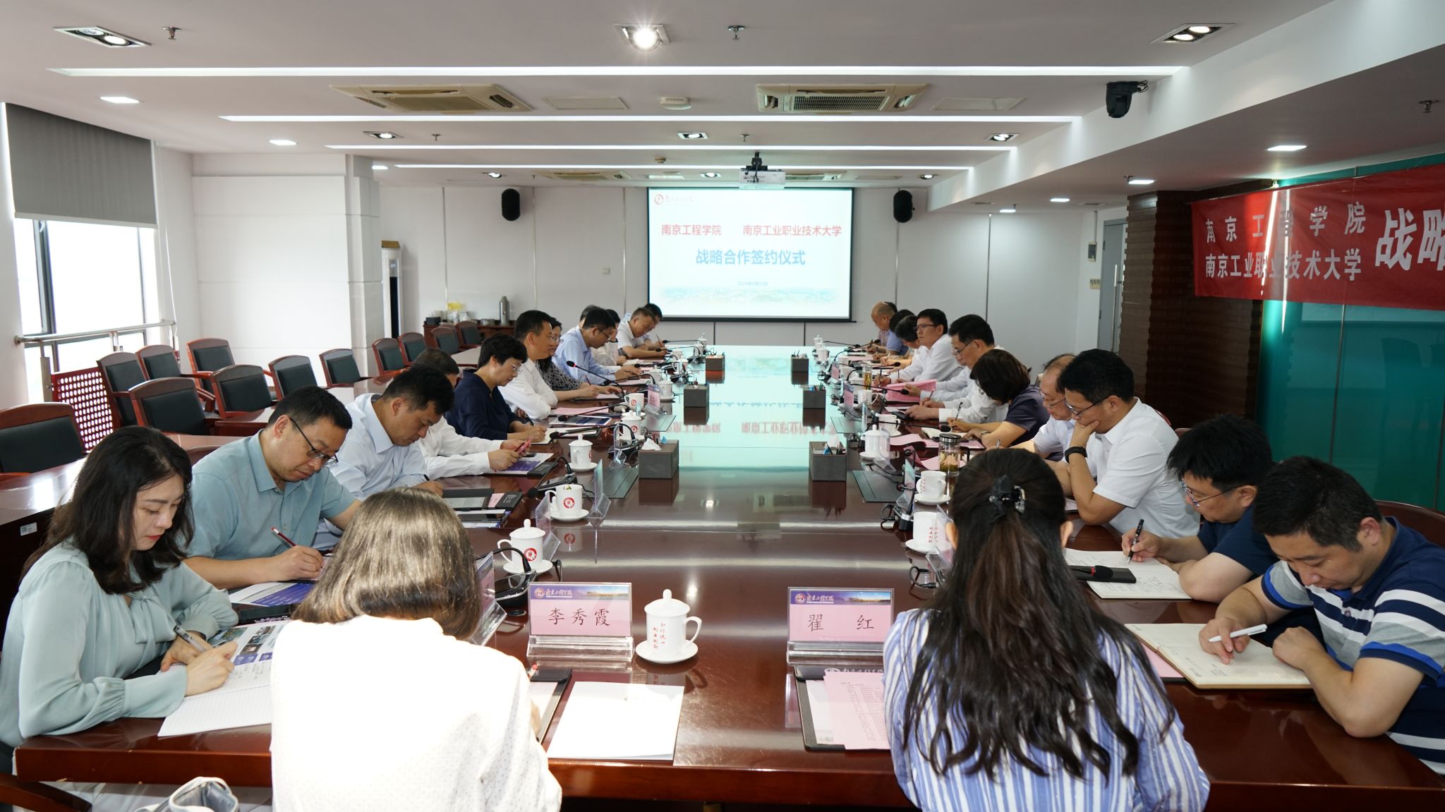 6月25日,我校与南京工业职业技术大学战略合作签约仪式在至勤楼·行政中心北303会议室举行,携手开启“校校合作、共谋发展”的崭新篇章。我校党委书记孙爱武,党委副书记、校长张仰飞,党委副书记濮励杰,党委常委、副校长汪群、朱松青、赵文祥;南京工业职业技术大学党委书记、校长谢永华,党委常委、副校长魏萍、苏小冬、孙雁飞、崔新明、潘旭海等出席签约仪式。会议由濮励杰主持。