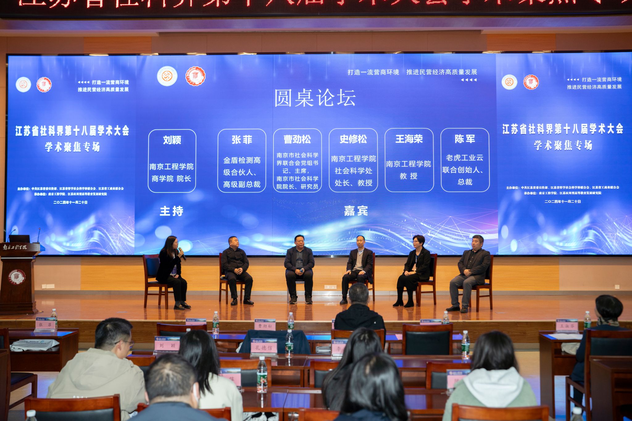 下午,大会举行学术圆桌论坛,南京市社科联主席、党组书记,南京市社会科学院院长、研究员曹劲松,金盾检测高级合伙人、高级副总裁张菲,老虎工业云联合创始人、总裁陈军,我校社会科学处处长史修松教授、商学院王海荣教授参与对话。论坛由我校商学院院长刘颖主持。